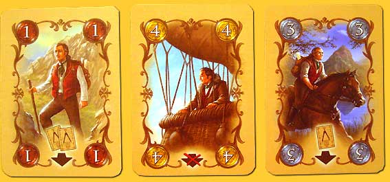 All players select and reveal their cards simultaneously, choosing cards in just one colour: bronze, silver or gold. The player who is in front starts by moving the added value of his cards. When he crosses a mapboard section, a new section is added from the blind pile. Each section has one 'treasure' that is worth from 1 to 3 points. When a player lands on it, he may take it. The total value of the played cards must be moved, no more, no less.
