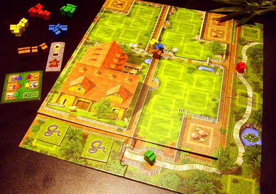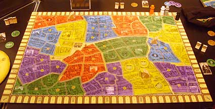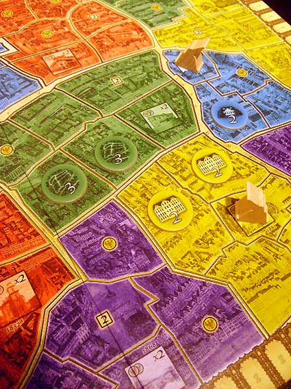 Players start with three randomly drawn chits that they keep secret to other players. Each turn they place one in a quarter of the matching colour. They score for the value on the chit, plus for each matching symbol for chits already placed in that quarter; there are three symbols: fields, houses and mansions.