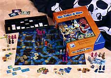 Honor point can be gathered at several places on the board but players can only do this if the captain himself moves there. The biggest problem is that all the groups only have this one leader. Five rounds are played, and every round there are less pirates available because the leader only visits a place if a player has a pirate of that group left behind. By paying extra money the leader can be moved twice. When the gang wants to lie and rest down a bit, dice duels are fought for the best sleeping spots, where the input of a barrel of rum can change the outcome of the fight. The game has a variable mapboard. In the end it all comes down to have earned the most honour. For 2 to 5 players, 9 years and up, 60 to 75 minutes. |