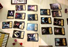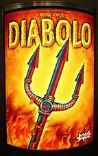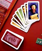 Dice determine which character card may be taken. Three rolls may be performed, and different combinations must be made in order to get certain higher cards. These cards have special abilities, like throwing an additional die. These abilites may only be performed once; the card then has to be tilted sideways. The player who is the first to get to the king and queen, triggers the end of the game. 2 to 5 players, 10 years and up, 45 minutes. |
