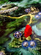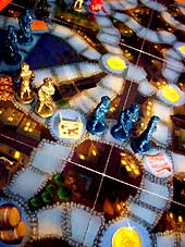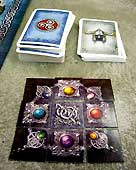 Five different coloured druids are on their way; there is an unnamed starting point and a nameless end point that triggers games end when one of the druids gets there. With these druids players try to collect and set an amulet with a set of all different coloured stones. At various locations on the board a player gets 1 to 3 stones to choose from a display. At other places a player has to hand in stones but in exchange he may take an extra coloured card