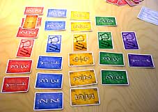 Simpel card game that has reminiscence of 'Adam & Eva'. Every player gets 7 cards. Five colours are in the game; the indicating cards are put on the table. They have a plus and a minus side. Every colour can have a maximum of five cards in a row. When the second row of any colour is completed, all remaining unplayed cards of the players are scored. When a row has a negative balance, these are substracted; if it has a postive balance they are added. There are some special cards in the deck that double the points for a side in a row; nice for you, and bad luck for the other players, hopefully. After a certain agreed number of rounds the game ends and the player with the highest total has won. For 3 to 5 players, 8 years and up, 30 minutes. |