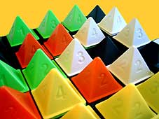 Advanced play introduces the numbers on the pyramid, Now not only a player will have to get across, but preferably with a high numbered pyramid too. When one player has got all his necessary pyramids across, all players count the numbers of the pyramids that have reached the other side.