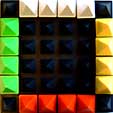 On a grid of six by six pyramids players have to bring a number of pyramids to the other side. Movement is forward or sideways. That may sound simple, but soon players get mingled and stumble over each other. A pyramid that goes over that of an other player, blocks the underlying piece for the moment; that player cannot move it. But at any point, the player on top will have to move forward to get to the other side, freeing that pyramid again.